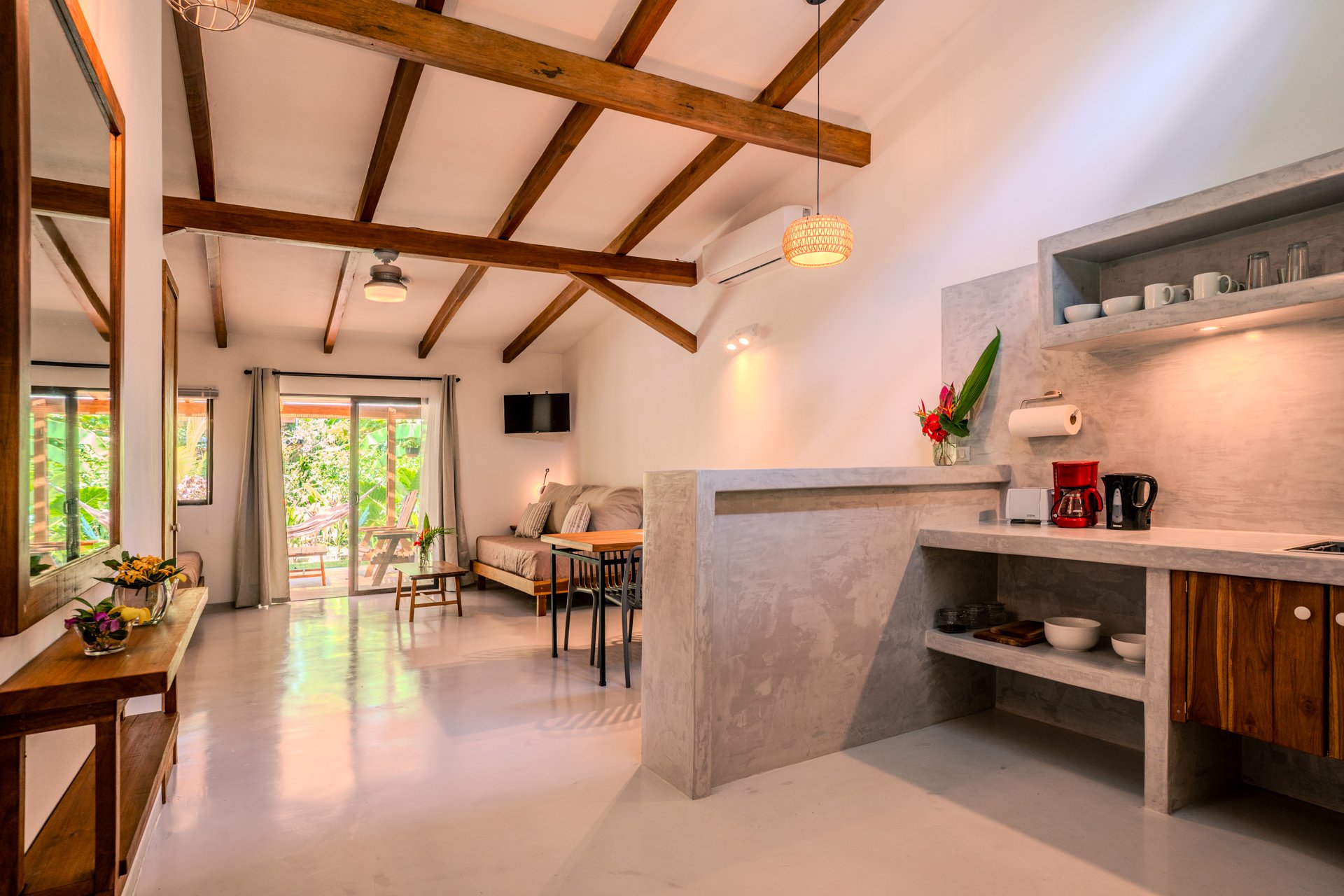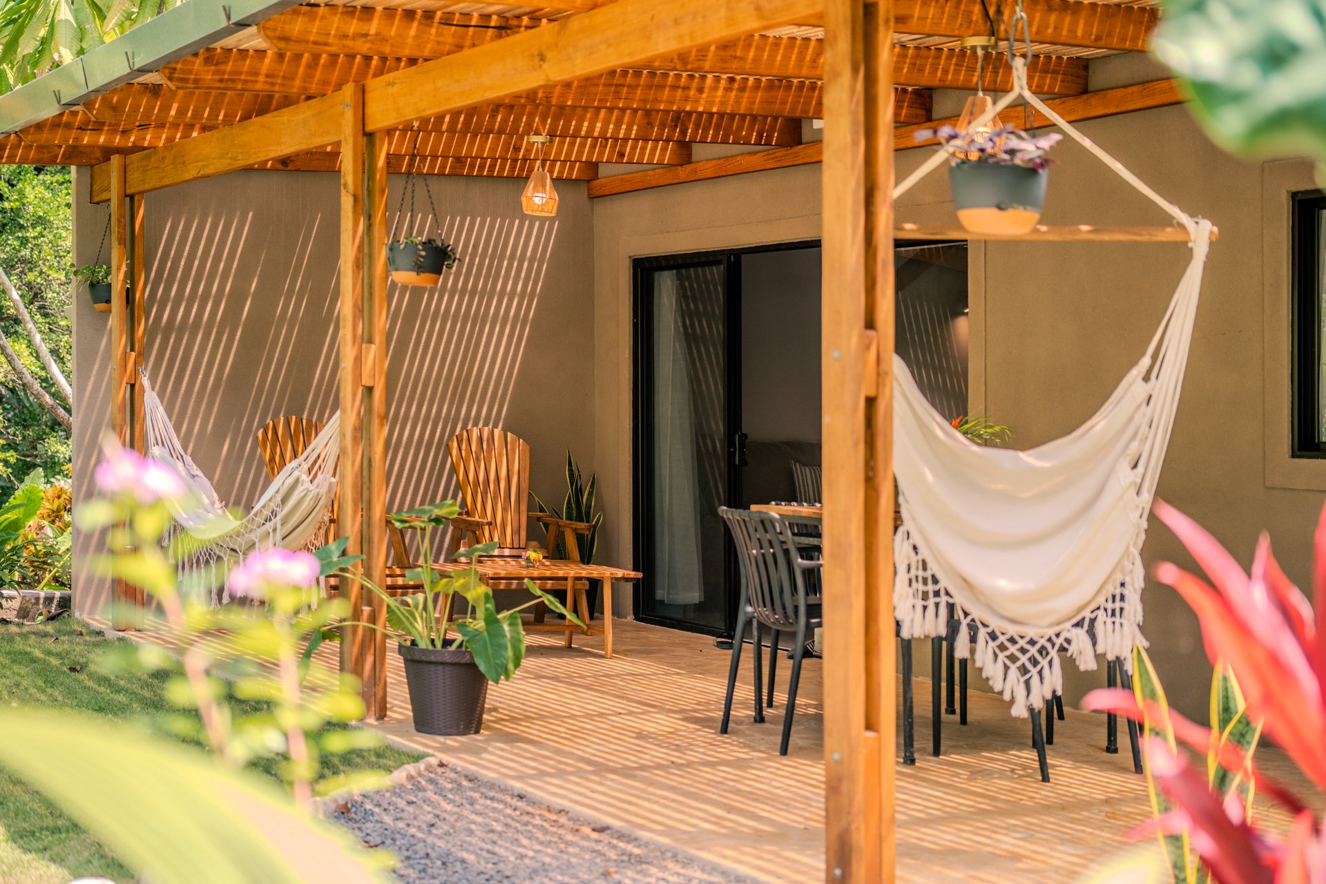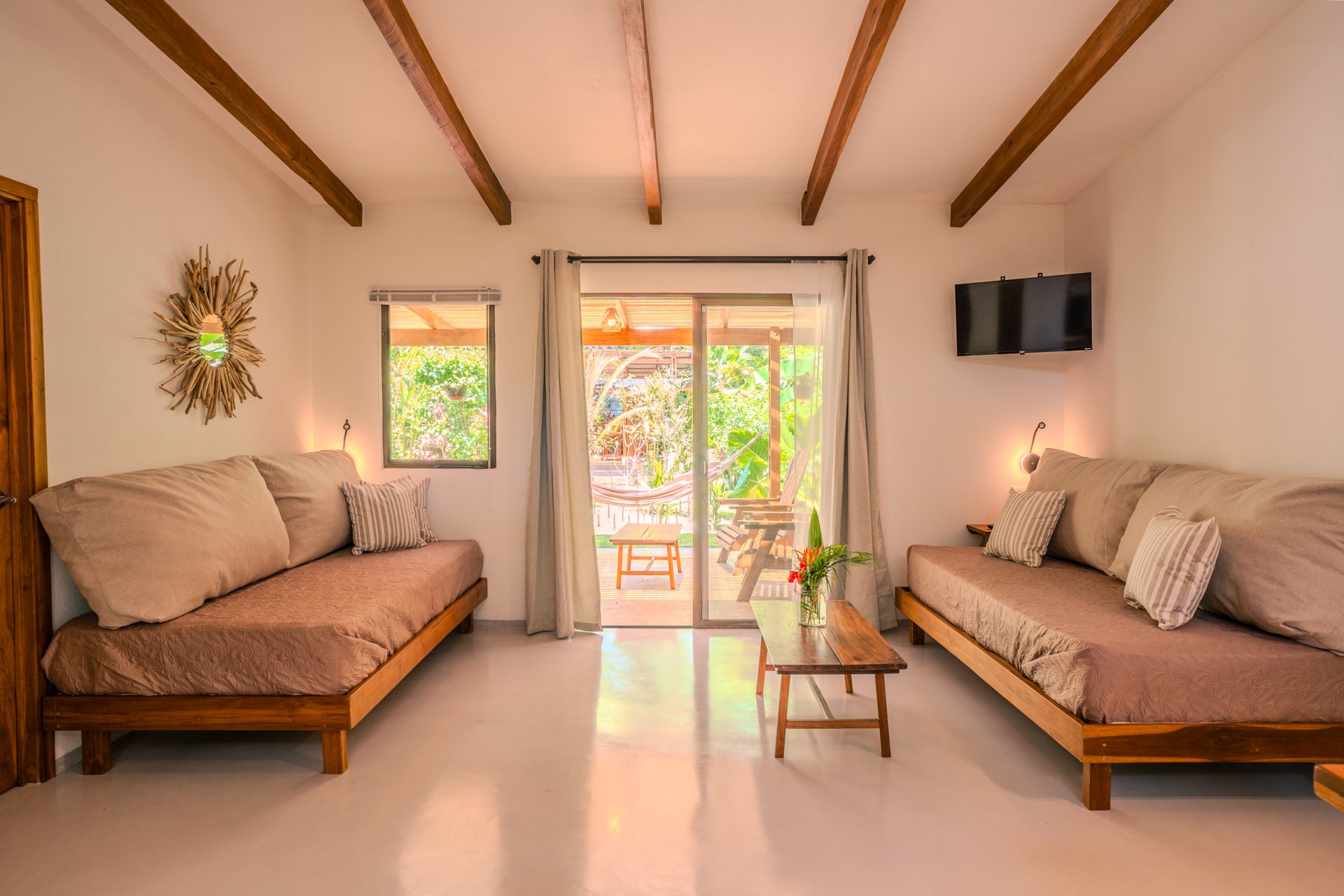 Discover our amazing recently built cabin, designed for four people, offering a unique experience within 80m2. With a fully equipped kitchen, a queen-size bed, and two single beds, we blend comfort and versatility. This cabin provides a large terrace with hammocks, sitting area and outdoor chairs where you can delight in observing monkeys and other animals. While the pool and barbecue area are shared spaces, everything else is exclusively yours. Immerse yourself in nature and create unforgettable memories in this space designed for wonder and connection.